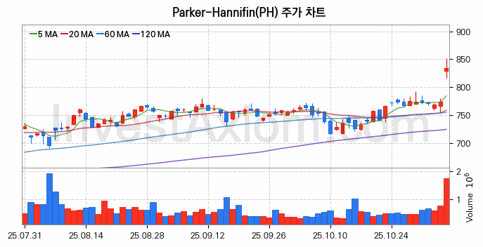 Parker-Hannifin (파커-하니핀) 주가 전망에 참고될 수 있는 상세한 주식 기술적 분석 결과(2025년 11월 06일 기준)를 제공하며, 전 거래일 대비 약 7.75% 상승한 미국 주식시장에 상장된 Parker-Hannifin 주식 종목의 주가 차트를 비롯해 주가 상태, 주식 거래량, 기간 수익률, 주가 이동평균 및 기간 주가 변동성 기반 분석 결과를 제공합니다.