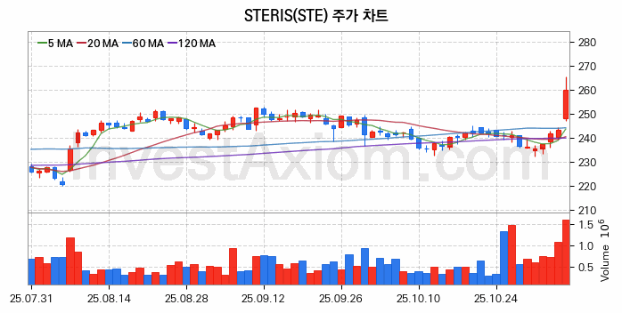 미국 주식 분석, STERIS (스테리스) 주가 차트 분석과 주식 기간 수익률 및 변동성 분석 (2025-11-06)