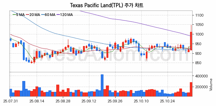Texas Pacific Land (텍사스 퍼시픽 랜드) 주가 전망에 참고될 수 있는 상세한 주식 기술적 분석 결과(2025년 11월 06일 기준)를 제공하며, 전 거래일 대비 약 10.02% 상승한 미국 주식시장에 상장된 Texas Pacific Land 주식 종목의 주가 차트를 비롯해 주가 상태, 주식 거래량, 기간 수익률, 주가 이동평균 및 기간 주가 변동성 기반 분석 결과를 제공합니다.