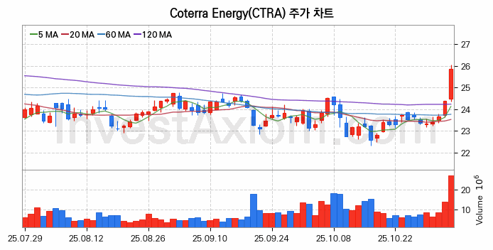 Coterra Energy (코테라 에너지) 주가 전망에 참고될 수 있는 상세한 주식 기술적 분석 결과(2025년 11월 04일 기준)를 제공하며, 전 거래일 대비 약 5.99% 상승한 미국 주식시장에 상장된 Coterra Energy 주식 종목의 주가 차트를 비롯해 주가 상태, 주식 거래량, 기간 수익률, 주가 이동평균 및 기간 주가 변동성 기반 분석 결과를 제공합니다.