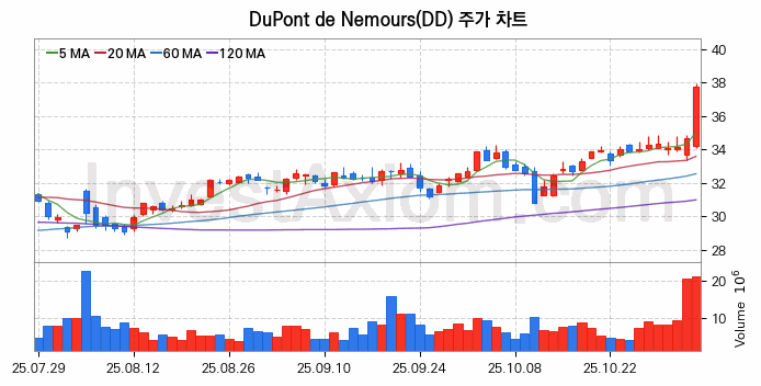 DuPont de Nemours (듀폰) 주가 전망에 참고될 수 있는 상세한 주식 기술적 분석 결과(2025년 11월 04일 기준)를 제공하며, 전 거래일 대비 약 8.85% 상승한 미국 주식시장에 상장된 DuPont de Nemours 주식 종목의 주가 차트를 비롯해 주가 상태, 주식 거래량, 기간 수익률, 주가 이동평균 및 기간 주가 변동성 기반 분석 결과를 제공합니다.
