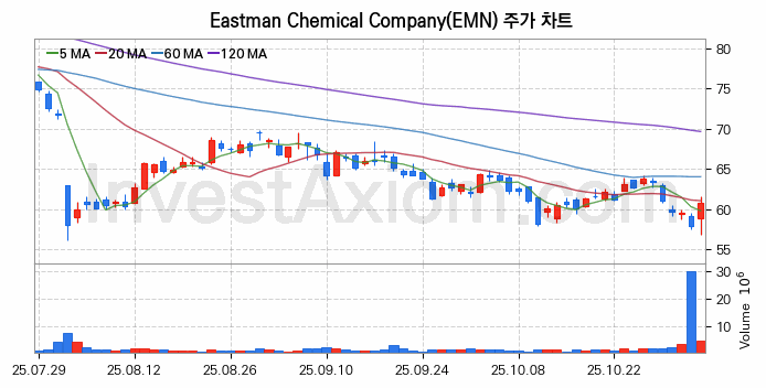 미국 주식 분석, Eastman Chemical Company (이스트만 케미컬) 주가 차트 분석과 주식 기간 수익률 및 변동성 분석 (2025-11-04)