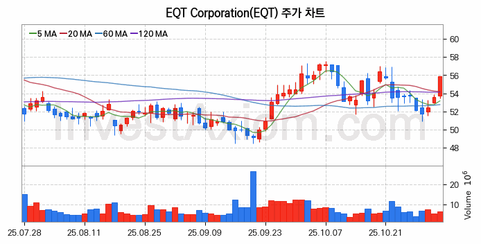 EQT Corporation (EQT) 주가 전망에 참고될 수 있는 상세한 주식 기술적 분석 결과(2025년 11월 03일 기준)를 제공하며, 전 거래일 대비 약 4.26% 상승한 미국 주식시장에 상장된 EQT Corporation 주식 종목의 주가 차트를 비롯해 주가 상태, 주식 거래량, 기간 수익률, 주가 이동평균 및 기간 주가 변동성 기반 분석 결과를 제공합니다.