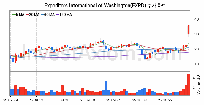 Expeditors International of Washington (익스페디터 인터내셔널 오브 워싱턴) 주가 전망에 참고될 수 있는 상세한 주식 기술적 분석 결과(2025년 11월 04일 기준)를 제공하며, 전 거래일 대비 약 10.84% 상승한 미국 주식시장에 상장된 Expeditors International of Washington 주식 종목의 주가 차트를 비롯해 주가 상태, 주식 거래량, 기간 수익률, 주가 이동평균 및 기간 주가 변동성 기반 분석 결과를 제공합니다.