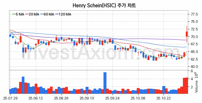 Henry Schein (헨리 셰인) 주가 전망에 참고될 수 있는 상세한 주식 기술적 분석 결과(2025년 11월 04일 기준)를 제공하며, 전 거래일 대비 약 10.78% 상승한 미국 주식시장에 상장된 Henry Schein 주식 종목의 주가 차트를 비롯해 주가 상태, 주식 거래량, 기간 수익률, 주가 이동평균 및 기간 주가 변동성 기반 분석 결과를 제공합니다.