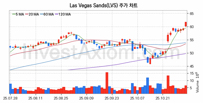 Las Vegas Sands (라스베이거스 샌즈) 주가 전망에 참고될 수 있는 상세한 주식 기술적 분석 결과(2025년 11월 03일 기준)를 제공하며, 전 거래일 대비 약 4.01% 상승한 미국 주식시장에 상장된 Las Vegas Sands 주식 종목의 주가 차트를 비롯해 주가 상태, 주식 거래량, 기간 수익률, 주가 이동평균 및 기간 주가 변동성 기반 분석 결과를 제공합니다.