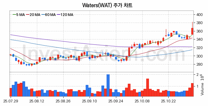 Waters (워터스) 주가 전망에 참고될 수 있는 상세한 주식 기술적 분석 결과(2025년 11월 04일 기준)를 제공하며, 전 거래일 대비 약 6.29% 상승한 미국 주식시장에 상장된 Waters 주식 종목의 주가 차트를 비롯해 주가 상태, 주식 거래량, 기간 수익률, 주가 이동평균 및 기간 주가 변동성 기반 분석 결과를 제공합니다.