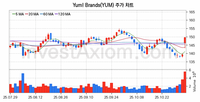 Yum! Brands (염 브랜즈) 주가 전망에 참고될 수 있는 상세한 주식 기술적 분석 결과(2025년 11월 04일 기준)를 제공하며, 전 거래일 대비 약 7.3% 상승한 미국 주식시장에 상장된 Yum! Brands 주식 종목의 주가 차트를 비롯해 주가 상태, 주식 거래량, 기간 수익률, 주가 이동평균 및 기간 주가 변동성 기반 분석 결과를 제공합니다.