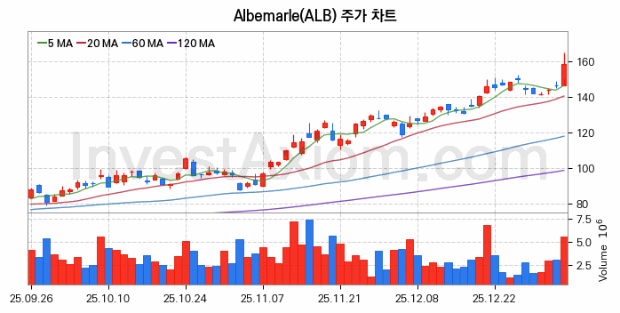 Albemarle (앨버말) 주가 전망에 참고될 수 있는 상세한 주식 기술적 분석 결과(2026년 01월 06일 기준)를 제공하며, 전 거래일 대비 약 8.23% 상승한 미국 주식시장에 상장된 Albemarle 주식 종목의 주가 차트를 비롯해 주가 상태, 주식 거래량, 기간 수익률, 주가 이동평균 및 기간 주가 변동성 기반 분석 결과를 제공합니다.