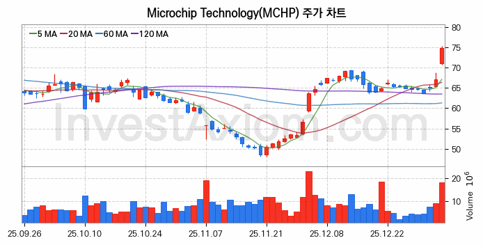 Microchip Technology (마이크로칩 테크놀러지) 주가 전망에 참고될 수 있는 상세한 주식 기술적 분석 결과(2026년 01월 06일 기준)를 제공하며, 전 거래일 대비 약 11.65% 상승한 미국 주식시장에 상장된 Microchip Technology 주식 종목의 주가 차트를 비롯해 주가 상태, 주식 거래량, 기간 수익률, 주가 이동평균 및 기간 주가 변동성 기반 분석 결과를 제공합니다.