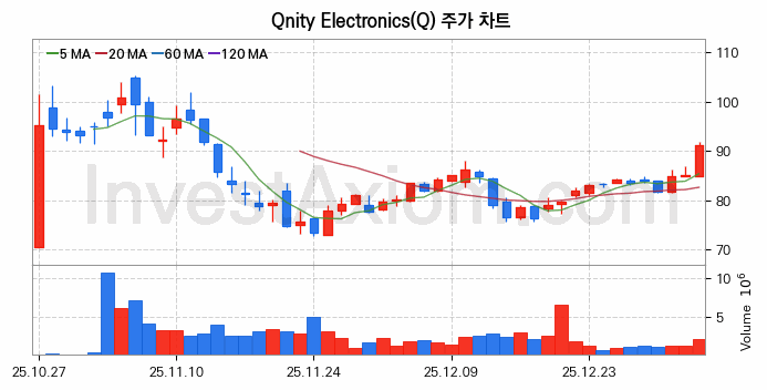 Qnity Electronics (큐니티 일렉트로닉스) 주가 전망에 참고될 수 있는 상세한 주식 기술적 분석 결과(2026년 01월 06일 기준)를 제공하며, 전 거래일 대비 약 7.08% 상승한 미국 주식시장에 상장된 Qnity Electronics 주식 종목의 주가 차트를 비롯해 주가 상태, 주식 거래량, 기간 수익률, 주가 이동평균 및 기간 주가 변동성 기반 분석 결과를 제공합니다.