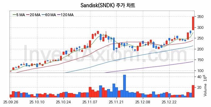 Sandisk (샌디스크) 주가 전망에 참고될 수 있는 상세한 주식 기술적 분석 결과(2026년 01월 06일 기준)를 제공하며, 전 거래일 대비 약 27.57% 상승한 미국 주식시장에 상장된 Sandisk 주식 종목의 주가 차트를 비롯해 주가 상태, 주식 거래량, 기간 수익률, 주가 이동평균 및 기간 주가 변동성 기반 분석 결과를 제공합니다.