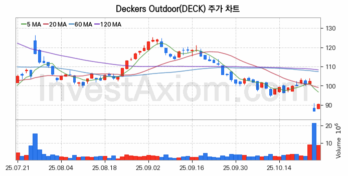 미국 주식 분석, Deckers Outdoor (덱커 아웃도어) 주가 차트 분석과 주식 기간 수익률 및 변동성 분석 (2025-10-27)