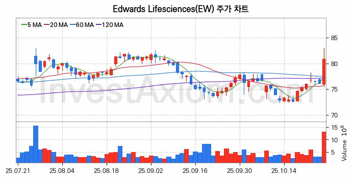 Edwards Lifesciences (에드워즈 라이프사이언시스) 주가 전망에 참고될 수 있는 상세한 주식 기술적 분석 결과(2025년 10월 27일 기준)를 제공하며, 전 거래일 대비 약 6.2% 상승한 미국 주식시장에 상장된 Edwards Lifesciences 주식 종목의 주가 차트를 비롯해 주가 상태, 주식 거래량, 기간 수익률, 주가 이동평균 및 기간 주가 변동성 기반 분석 결과를 제공합니다.
