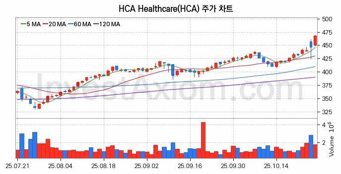 HCA Healthcare (HCA 헬스케어) 주가 전망에 참고될 수 있는 상세한 주식 기술적 분석 결과(2025년 10월 27일 기준)를 제공하며, 전 거래일 대비 약 4.66% 상승한 미국 주식시장에 상장된 HCA Healthcare 주식 종목의 주가 차트를 비롯해 주가 상태, 주식 거래량, 기간 수익률, 주가 이동평균 및 기간 주가 변동성 기반 분석 결과를 제공합니다.