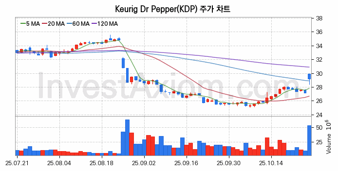 Keurig Dr Pepper (큐리그 닥터 페퍼) 주가 전망에 참고될 수 있는 상세한 주식 기술적 분석 결과(2025년 10월 27일 기준)를 제공하며, 전 거래일 대비 약 7.62% 상승한 미국 주식시장에 상장된 Keurig Dr Pepper 주식 종목의 주가 차트를 비롯해 주가 상태, 주식 거래량, 기간 수익률, 주가 이동평균 및 기간 주가 변동성 기반 분석 결과를 제공합니다.