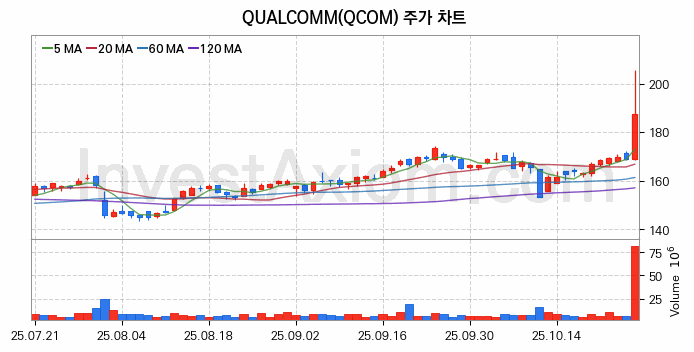 QUALCOMM (퀄컴) 주가 전망에 참고될 수 있는 상세한 주식 기술적 분석 결과(2025년 10월 27일 기준)를 제공하며, 전 거래일 대비 약 11.09% 상승한 미국 주식시장에 상장된 QUALCOMM 주식 종목의 주가 차트를 비롯해 주가 상태, 주식 거래량, 기간 수익률, 주가 이동평균 및 기간 주가 변동성 기반 분석 결과를 제공합니다.