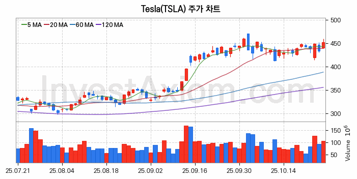 Tesla (테슬라) 주가 전망에 참고될 수 있는 상세한 주식 기술적 분석 결과(2025년 10월 27일 기준)를 제공하며, 전 거래일 대비 약 4.31% 상승한 미국 주식시장에 상장된 Tesla 주식 종목의 주가 차트를 비롯해 주가 상태, 주식 거래량, 기간 수익률, 주가 이동평균 및 기간 주가 변동성 기반 분석 결과를 제공합니다.