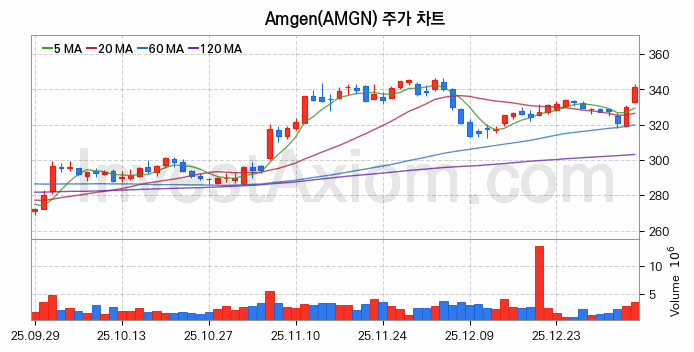 미국 주식 분석, Amgen (암젠) 주가 차트 분석과 주식 기간 수익률 및 변동성 분석 (2026-01-07)