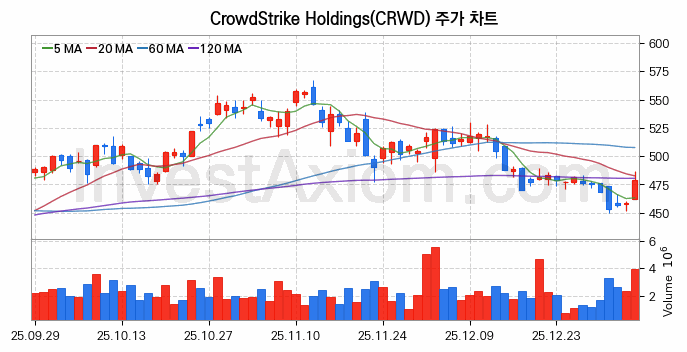CrowdStrike Holdings (크라우드 스트라이크 홀딩스 Class A) 주가 전망에 참고될 수 있는 상세한 주식 기술적 분석 결과(2026년 01월 07일 기준)를 제공하며, 전 거래일 대비 약 4.49% 상승한 미국 주식시장에 상장된 CrowdStrike Holdings 주식 종목의 주가 차트를 비롯해 주가 상태, 주식 거래량, 기간 수익률, 주가 이동평균 및 기간 주가 변동성 기반 분석 결과를 제공합니다.