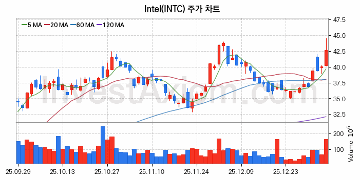 Intel (인텔) 주가 전망에 참고될 수 있는 상세한 주식 기술적 분석 결과(2026년 01월 07일 기준)를 제공하며, 전 거래일 대비 약 6.47% 상승한 미국 주식시장에 상장된 Intel 주식 종목의 주가 차트를 비롯해 주가 상태, 주식 거래량, 기간 수익률, 주가 이동평균 및 기간 주가 변동성 기반 분석 결과를 제공합니다.