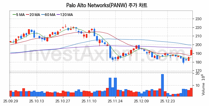 Palo Alto Networks (팔로 알토 네트웍스) 주가 전망에 참고될 수 있는 상세한 주식 기술적 분석 결과(2026년 01월 07일 기준)를 제공하며, 전 거래일 대비 약 4.33% 상승한 미국 주식시장에 상장된 Palo Alto Networks 주식 종목의 주가 차트를 비롯해 주가 상태, 주식 거래량, 기간 수익률, 주가 이동평균 및 기간 주가 변동성 기반 분석 결과를 제공합니다.