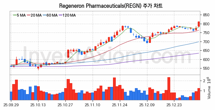 Regeneron Pharmaceuticals (리제네론 파마슈티컬스) 주가 전망에 참고될 수 있는 상세한 주식 기술적 분석 결과(2026년 01월 07일 기준)를 제공하며, 전 거래일 대비 약 4.6% 상승한 미국 주식시장에 상장된 Regeneron Pharmaceuticals 주식 종목의 주가 차트를 비롯해 주가 상태, 주식 거래량, 기간 수익률, 주가 이동평균 및 기간 주가 변동성 기반 분석 결과를 제공합니다.