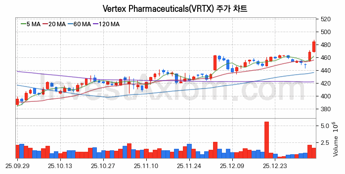 Vertex Pharmaceuticals (버텍스 파마슈티컬) 주가 전망에 참고될 수 있는 상세한 주식 기술적 분석 결과(2026년 01월 07일 기준)를 제공하며, 전 거래일 대비 약 3.37% 상승한 미국 주식시장에 상장된 Vertex Pharmaceuticals 주식 종목의 주가 차트를 비롯해 주가 상태, 주식 거래량, 기간 수익률, 주가 이동평균 및 기간 주가 변동성 기반 분석 결과를 제공합니다.
