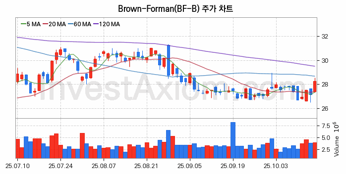 미국 주식 분석, Brown-Forman (브라운-포맨 Class B) 주가 차트 분석과 주식 기간 수익률 및 변동성 분석 (2025-10-16)