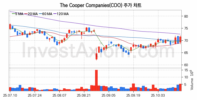 The Cooper Companies (쿠퍼) 주가 전망에 참고될 수 있는 상세한 주식 기술적 분석 결과(2025년 10월 16일 기준)를 제공하며, 전 거래일 대비 약 4.07% 상승한 미국 주식시장에 상장된 The Cooper Companies 주식 종목의 주가 차트를 비롯해 주가 상태, 주식 거래량, 기간 수익률, 주가 이동평균 및 기간 주가 변동성 기반 분석 결과를 제공합니다.
