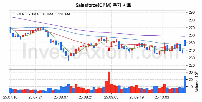 Salesforce (세일즈포스) 주가 전망에 참고될 수 있는 상세한 주식 기술적 분석 결과(2025년 10월 16일 기준)를 제공하며, 전 거래일 대비 약 3.98% 상승한 미국 주식시장에 상장된 Salesforce 주식 종목의 주가 차트를 비롯해 주가 상태, 주식 거래량, 기간 수익률, 주가 이동평균 및 기간 주가 변동성 기반 분석 결과를 제공합니다.