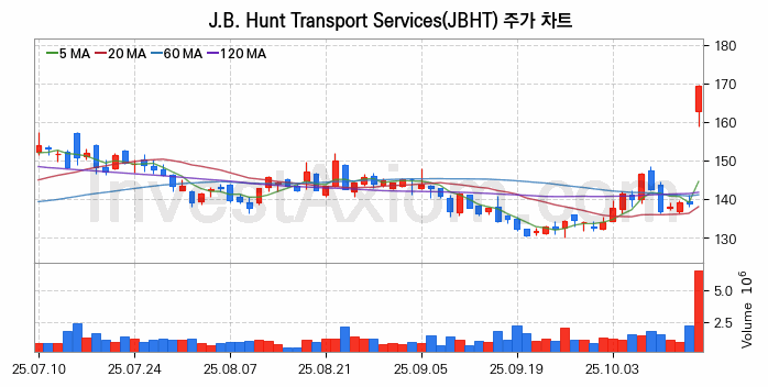 J.B. Hunt Transport Services (J.B 헌트 운송 서비스) 주가 전망에 참고될 수 있는 상세한 주식 기술적 분석 결과(2025년 10월 16일 기준)를 제공하며, 전 거래일 대비 약 22.14% 상승한 미국 주식시장에 상장된 J.B. Hunt Transport Services 주식 종목의 주가 차트를 비롯해 주가 상태, 주식 거래량, 기간 수익률, 주가 이동평균 및 기간 주가 변동성 기반 분석 결과를 제공합니다.