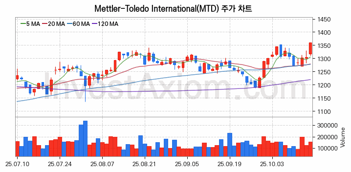 Mettler-Toledo International (메틀러 톨레도 인터내셔널) 주가 전망에 참고될 수 있는 상세한 주식 기술적 분석 결과(2025년 10월 16일 기준)를 제공하며, 전 거래일 대비 약 4.26% 상승한 미국 주식시장에 상장된 Mettler-Toledo International 주식 종목의 주가 차트를 비롯해 주가 상태, 주식 거래량, 기간 수익률, 주가 이동평균 및 기간 주가 변동성 기반 분석 결과를 제공합니다.
