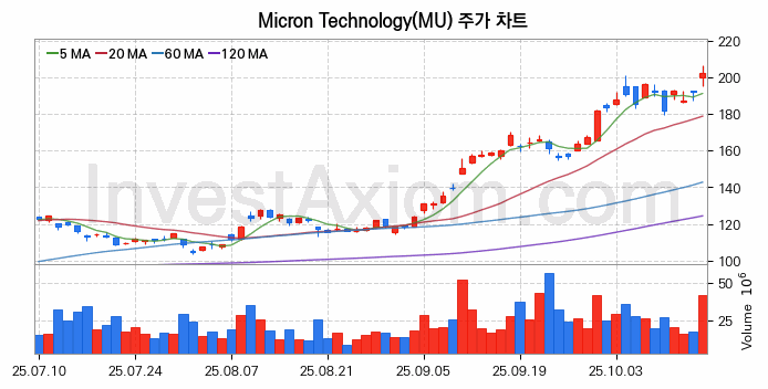 Micron Technology (마이크론 테크놀로지) 주가 전망에 참고될 수 있는 상세한 주식 기술적 분석 결과(2025년 10월 16일 기준)를 제공하며, 전 거래일 대비 약 5.52% 상승한 미국 주식시장에 상장된 Micron Technology 주식 종목의 주가 차트를 비롯해 주가 상태, 주식 거래량, 기간 수익률, 주가 이동평균 및 기간 주가 변동성 기반 분석 결과를 제공합니다.