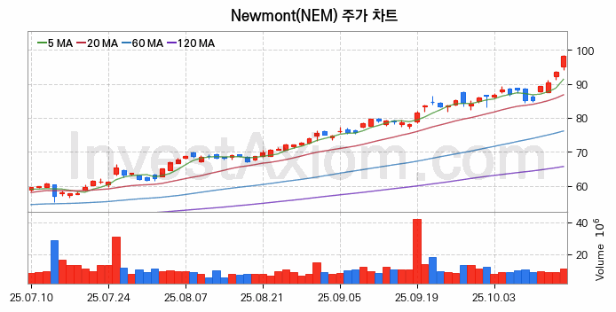 Newmont (뉴몬트) 주가 전망에 참고될 수 있는 상세한 주식 기술적 분석 결과(2025년 10월 16일 기준)를 제공하며, 전 거래일 대비 약 5.01% 상승한 미국 주식시장에 상장된 Newmont 주식 종목의 주가 차트를 비롯해 주가 상태, 주식 거래량, 기간 수익률, 주가 이동평균 및 기간 주가 변동성 기반 분석 결과를 제공합니다.
