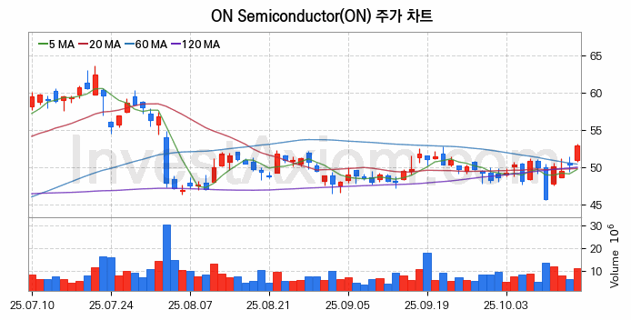 미국 주식 분석, ON Semiconductor (온 세미콘덕터) 주가 차트 분석과 주식 기간 수익률 및 변동성 분석 (2025-10-16)
