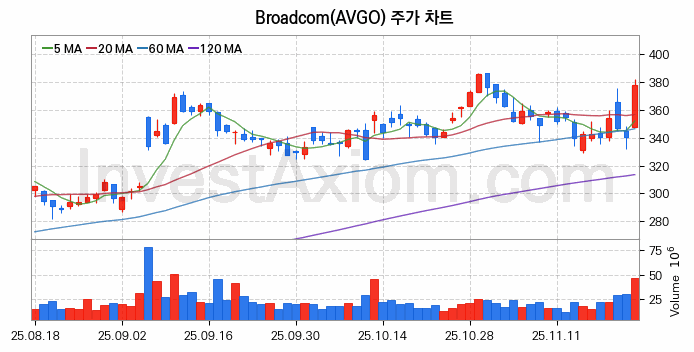 Broadcom (브로드컴) 주가 전망에 참고될 수 있는 상세한 주식 기술적 분석 결과(2025년 11월 24일 기준)를 제공하며, 전 거래일 대비 약 11.1% 상승한 미국 주식시장에 상장된 Broadcom 주식 종목의 주가 차트를 비롯해 주가 상태, 주식 거래량, 기간 수익률, 주가 이동평균 및 기간 주가 변동성 기반 분석 결과를 제공합니다.