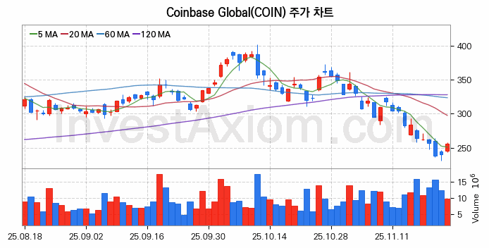 미국 주식 분석, Coinbase Global (코인베이스 글로벌 Class A) 주가 차트 분석과 주식 기간 수익률 및 변동성 분석 (2025-11-24)