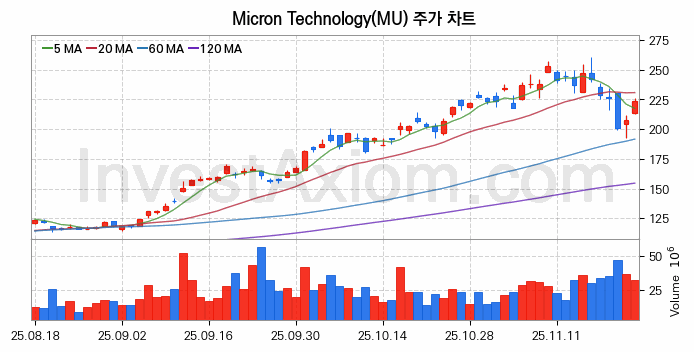 Micron Technology (마이크론 테크놀로지) 주가 전망에 참고될 수 있는 상세한 주식 기술적 분석 결과(2025년 11월 24일 기준)를 제공하며, 전 거래일 대비 약 7.99% 상승한 미국 주식시장에 상장된 Micron Technology 주식 종목의 주가 차트를 비롯해 주가 상태, 주식 거래량, 기간 수익률, 주가 이동평균 및 기간 주가 변동성 기반 분석 결과를 제공합니다.
