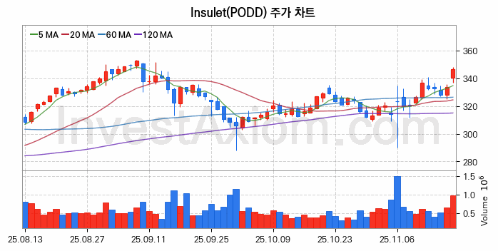 미국 주식 분석, Insulet (인슐릿) 주가 차트 분석과 주식 기간 수익률 및 변동성 분석 (2025-11-19)