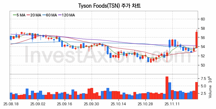 Tyson Foods (타이슨 푸드 Class A) 주가 전망에 참고될 수 있는 상세한 주식 기술적 분석 결과(2025년 11월 24일 기준)를 제공하며, 전 거래일 대비 약 6.52% 상승한 미국 주식시장에 상장된 Tyson Foods 주식 종목의 주가 차트를 비롯해 주가 상태, 주식 거래량, 기간 수익률, 주가 이동평균 및 기간 주가 변동성 기반 분석 결과를 제공합니다.