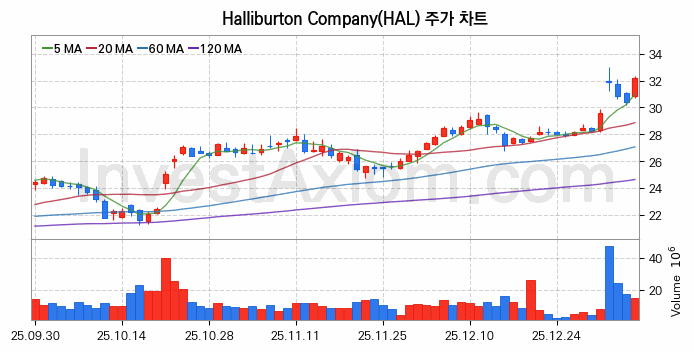 미국 주식 분석, Halliburton Company (할리버튼) 주가 차트 분석과 주식 기간 수익률 및 변동성 분석 (2026-01-08)