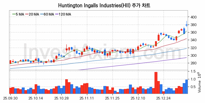 미국 주식 분석, Huntington Ingalls Industries (헌팅턴 잉걸스 인더스트리즈) 주가 차트 분석과 주식 기간 수익률 및 변동성 분석 (2026-01-08)