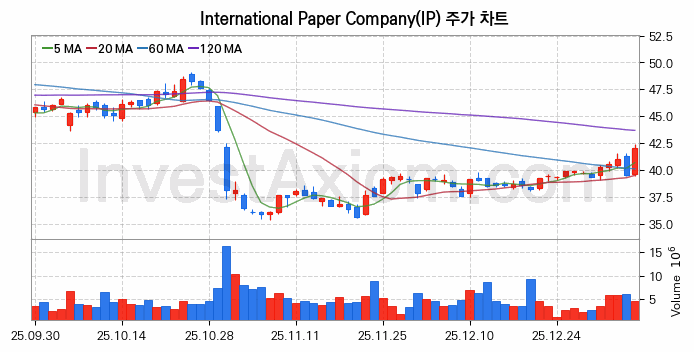 미국 주식 분석, International Paper Company (인터내셔널 페이퍼) 주가 차트 분석과 주식 기간 수익률 및 변동성 분석 (2026-01-08)