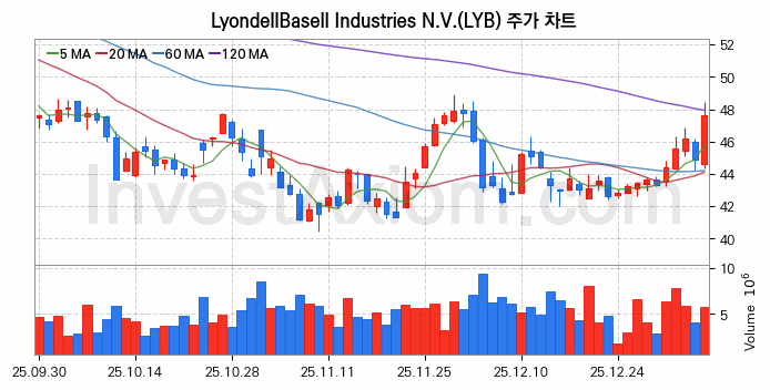 LyondellBasell Industries N.V. (라이온델바젤 인더스트리스 Class A) 주가 전망에 참고될 수 있는 상세한 주식 기술적 분석 결과(2026년 01월 08일 기준)를 제공하며, 전 거래일 대비 약 6.08% 상승한 미국 주식시장에 상장된 LyondellBasell Industries N.V. 주식 종목의 주가 차트를 비롯해 주가 상태, 주식 거래량, 기간 수익률, 주가 이동평균 및 기간 주가 변동성 기반 분석 결과를 제공합니다.