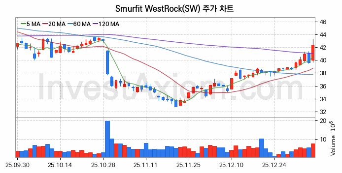 미국 주식 분석, Smurfit WestRock (스머핏 웨스트락) 주가 차트 분석과 주식 기간 수익률 및 변동성 분석 (2026-01-08)